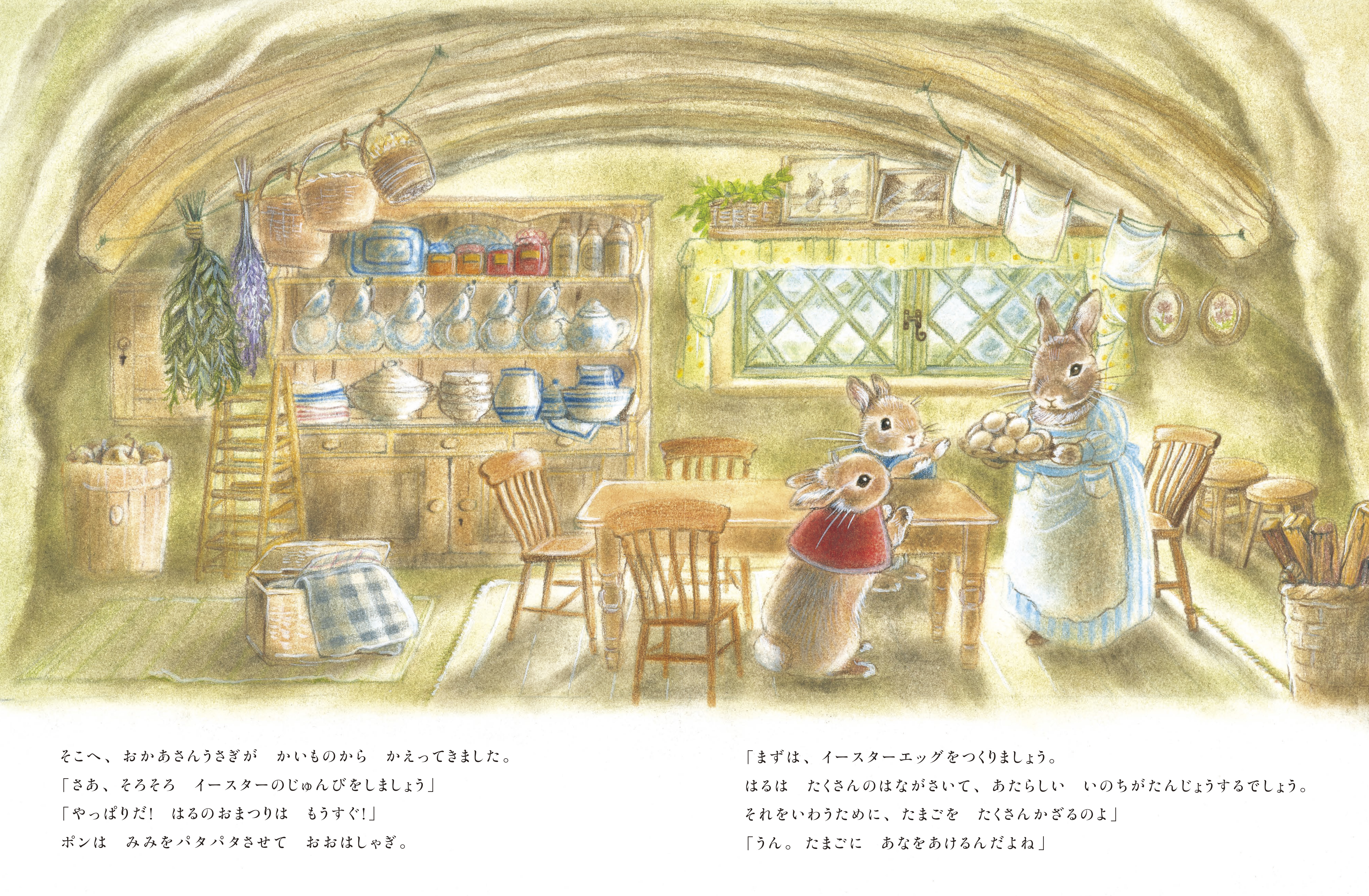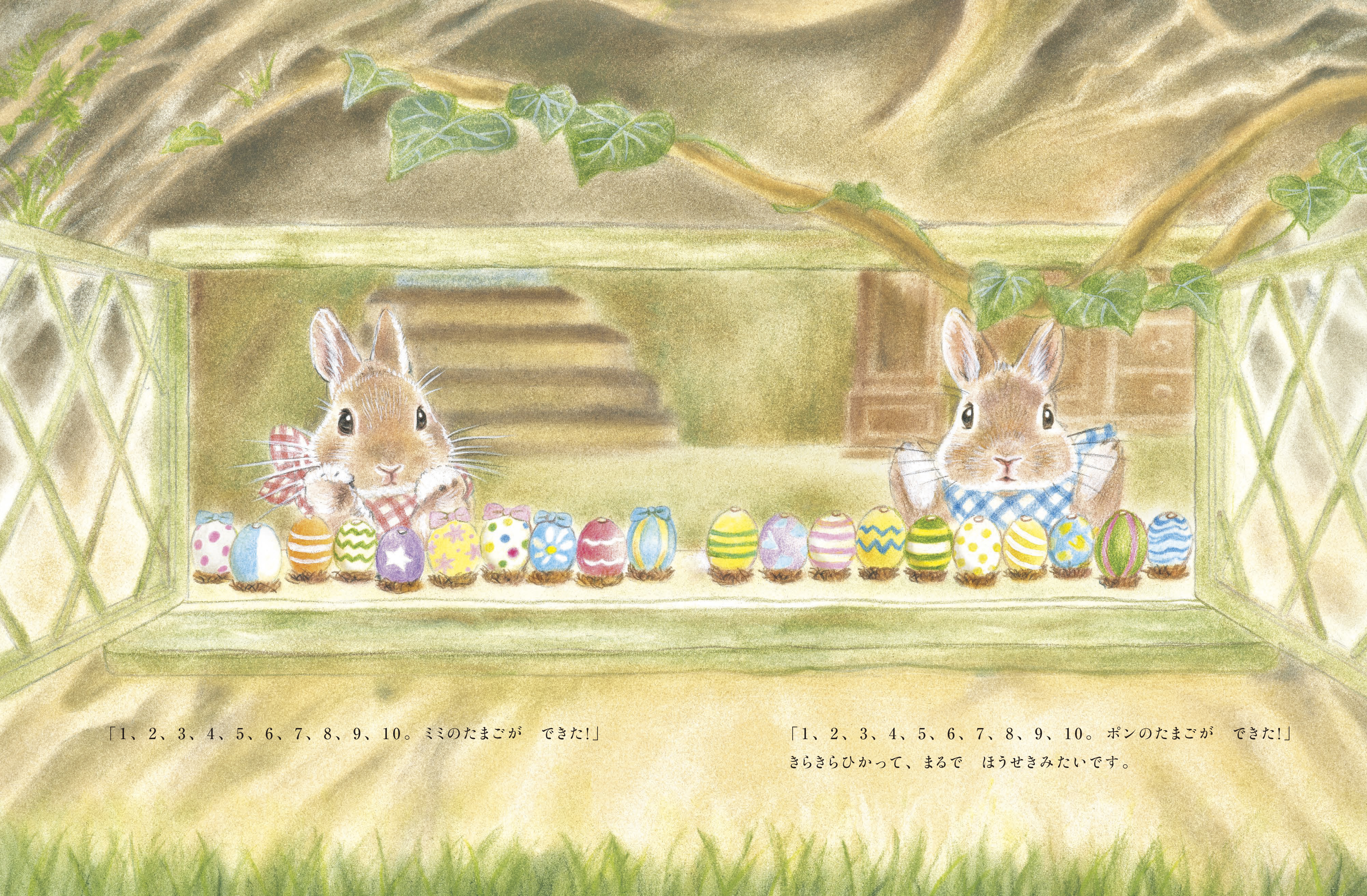 ふたごうさぎのミミとポンは、ことしはじめての「イースターうさぎ」のおとうばん。