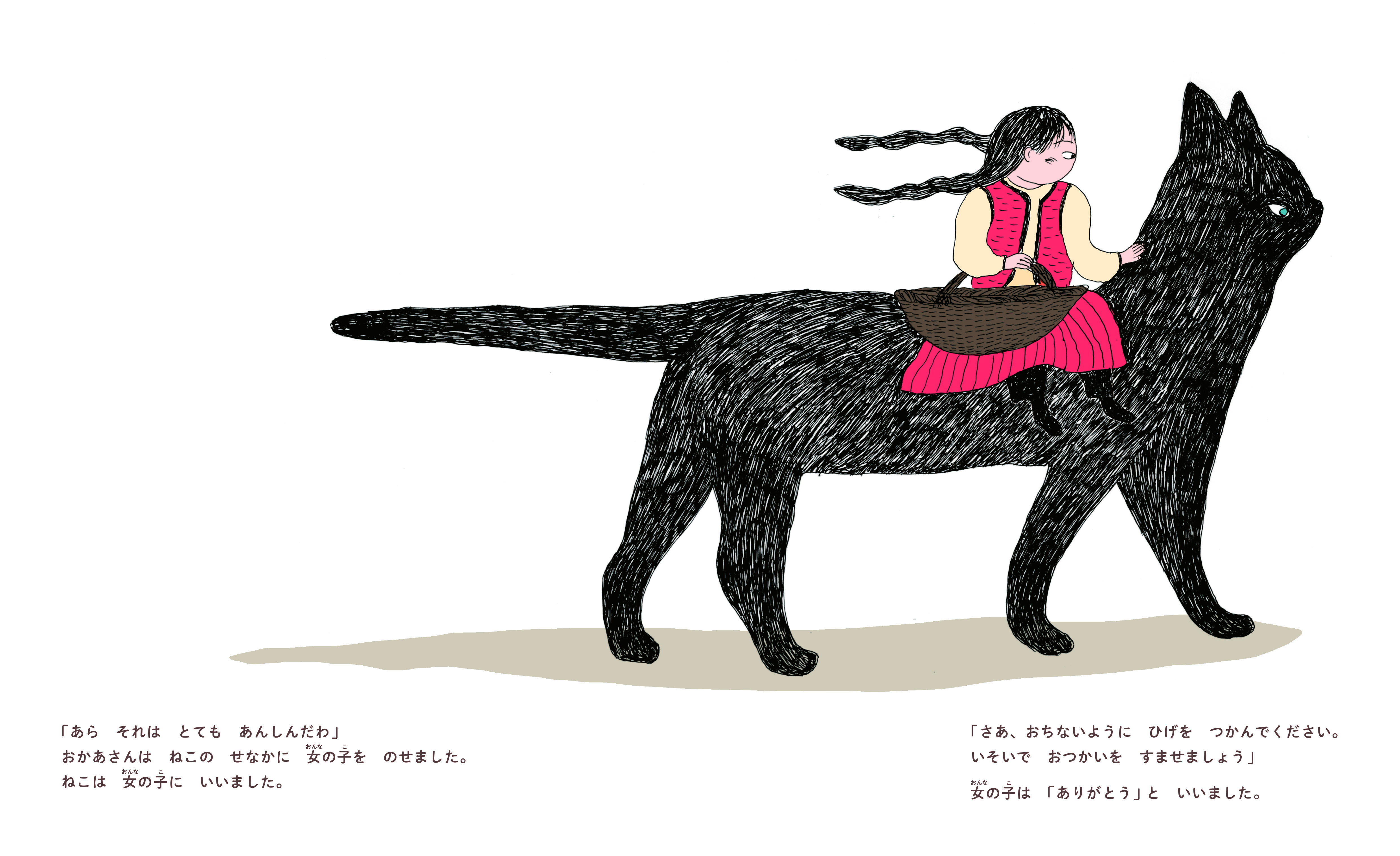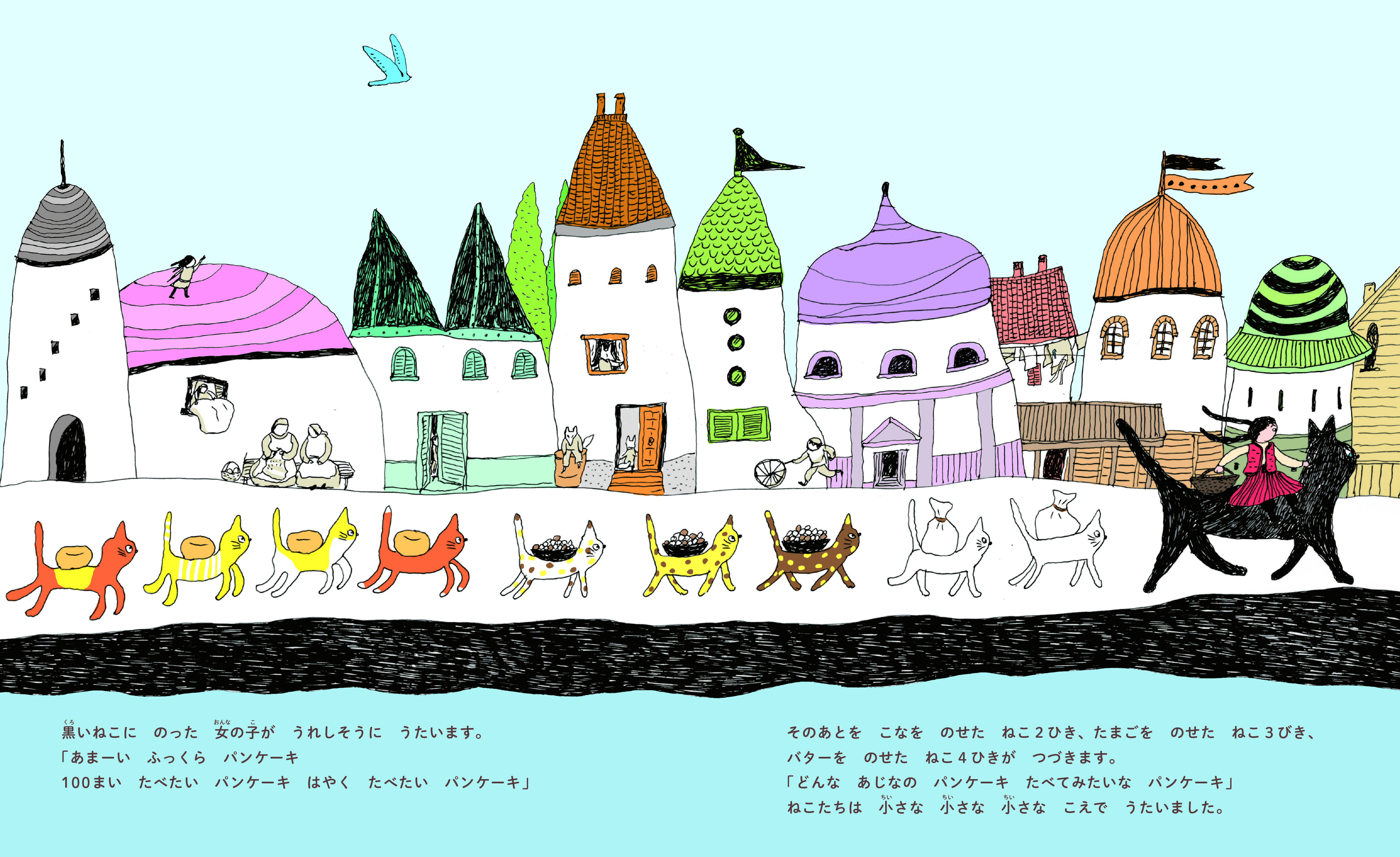 そこへ現れたのは大きな黒ねこ。行く先々でも、たくさんのねこたちが買い物のお手伝いをしてくれます。